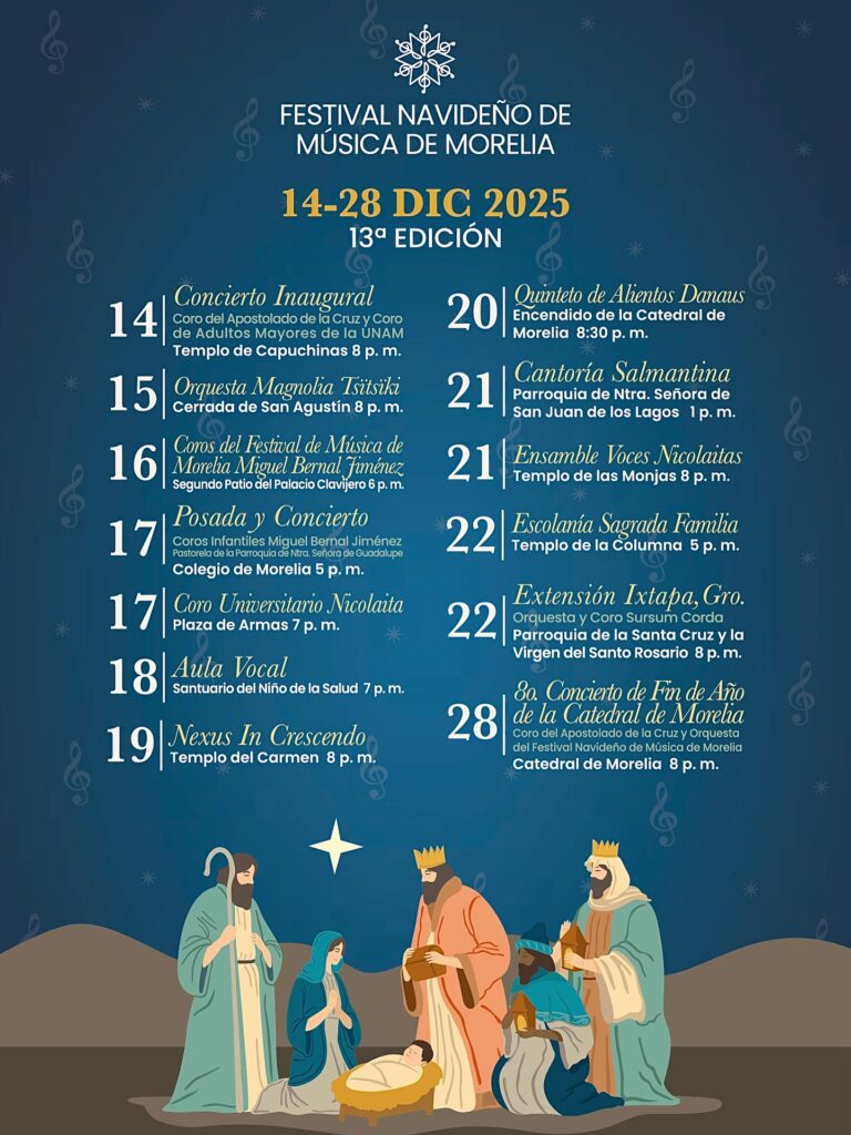 En el marco de las fiestas decembrinas, en la ciudad de Morelia se desarrolla el XIII Festival Navideño de Música, acompañado del Festival de Música Miguel Bernal Jiménez y diversos coros, para juntos ofrecer una serie de conciertos gratuitos en sitios públicos y religiosos.