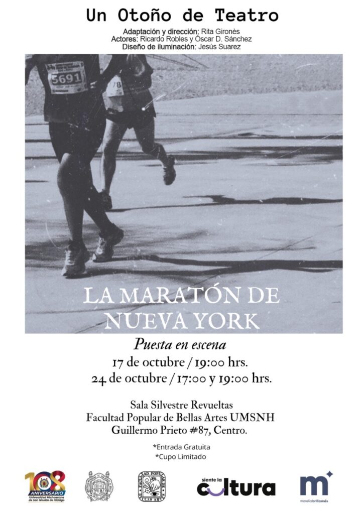 En esta ocasión, se presentará la puesta en escena “La Maratón de Nueva York”, del dramaturgo italiano Edoardo Erba, una pieza que se enfoca en la preparación física de los personajes, quienes corren durante toda la presentación.